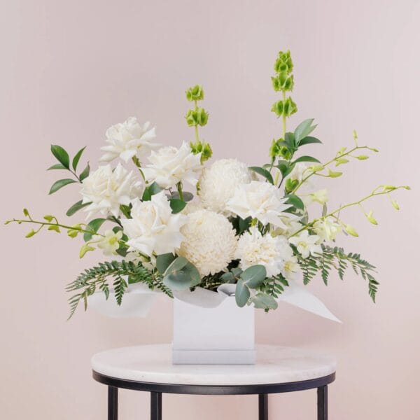 Our boxed arrangement in pure white offers comfort during sympathy. Featuring Roses, Disbuds, Carnations, and Orchids, it conveys heartfelt condolences with grace and tranquility.