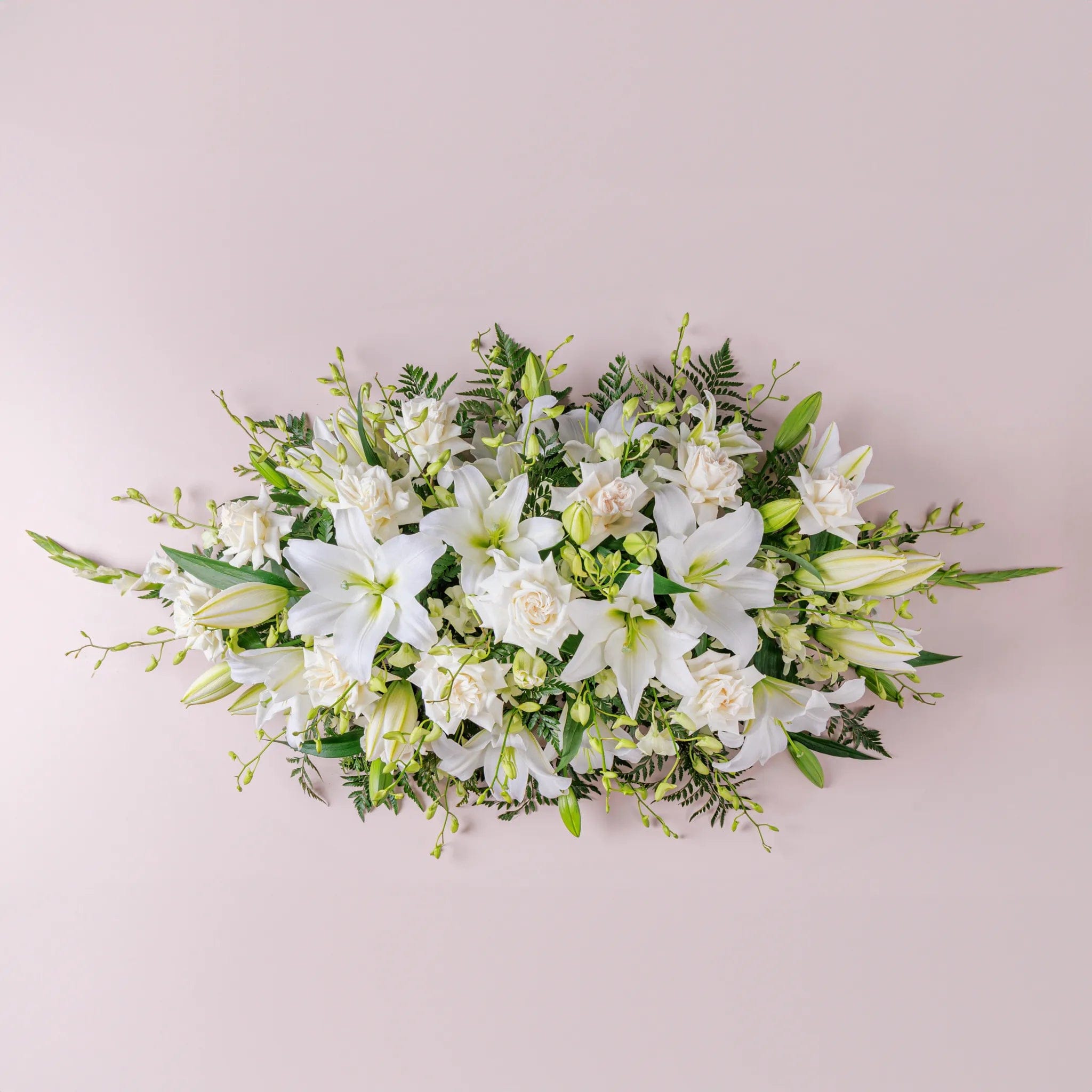 Create a lasting tribute with this breathtaking Heavenly Tribute casket spray, featuring an abundance of roses, lilies, and a captivating mix of blooms in soft whites.